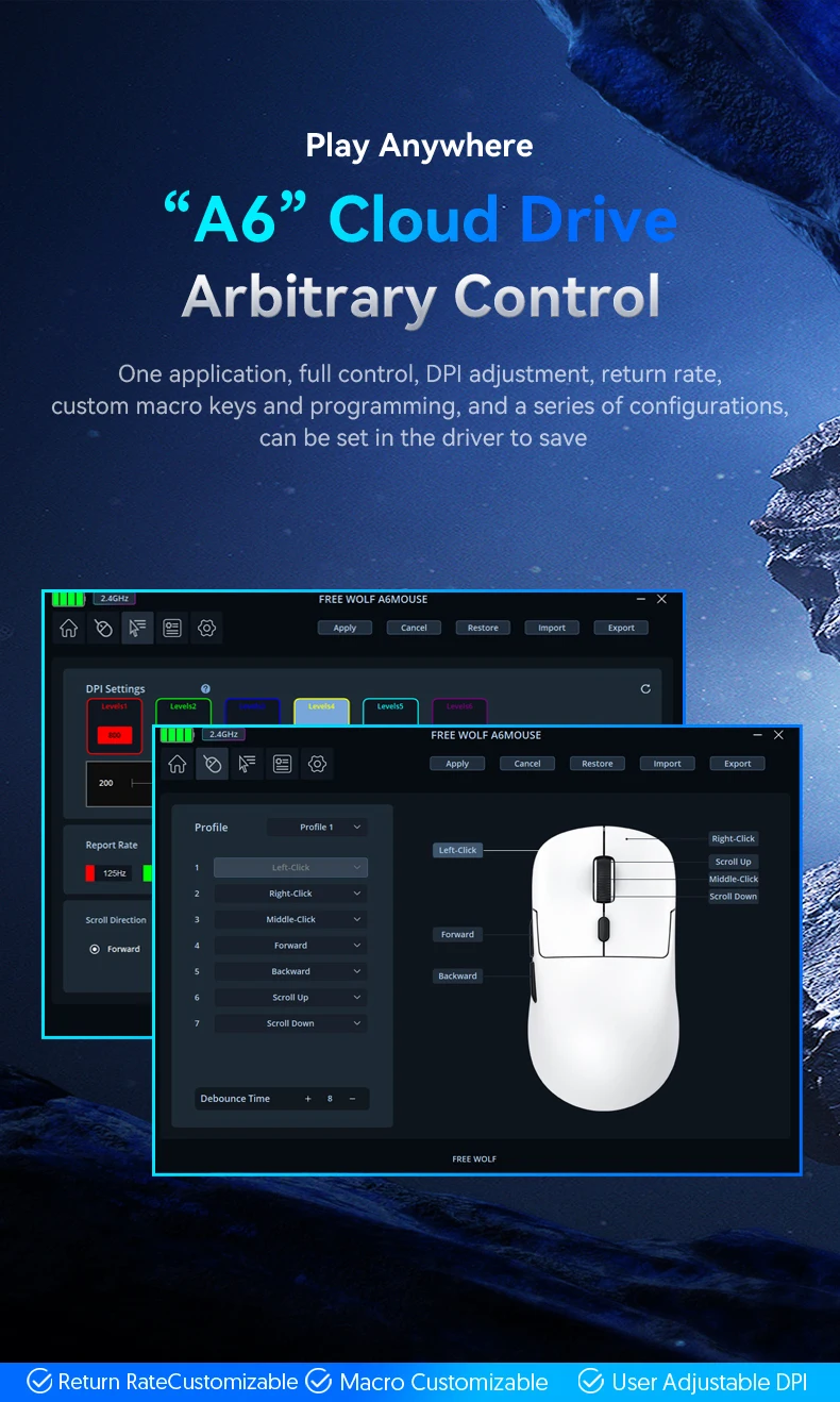 Home Mouse FREEWOLF A6 (24K DPI/3311)Stock OutFREEWOLF A6 (24K DPI/3311)6900 د.جOut of stockFREEWOLF A6 Wireless Bluetooth Ultra-Lightweight Gaming Mouse PAW3311 Sensor, 24000DPI, RGB, PC/Laptop Compatible Category: Mouse Description Related productsStock OutDelux M800 (PMW3335) 6500 د.ج Read more -6% AJAZZ AJ159 APEX Wireless 8KHz + Charging Dock 16900 د.ج – 17900 د.ج Select options This product has multiple variants. The options may be chosen on the product page Stock OutLogitech G102 5500 د.ج Read more Stock OutRedragon Storm M808 5900 د.ج Read more